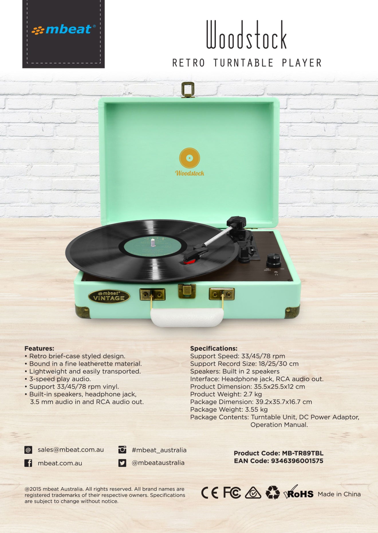 • 3-Speed Turntable – Plays 33, 45, and 78 RPM records